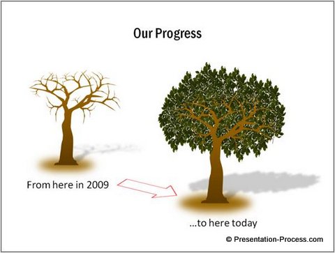 The progress from a sapling to a tree can be used as a visual history to represent the progress of a project or a business plan. You can add custom animation to make the elements one ater another to set the context or your slide.
