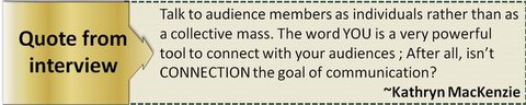 Kathryn: There are so many changes a speaker can make as I have over time. But the one that I would highlight is about talking to audience members as individuals rather than talking to the audience as a collective mass. The word YOU is a very powerful tool to connect with your audiences…after all, isn’t connection the goal of communication?