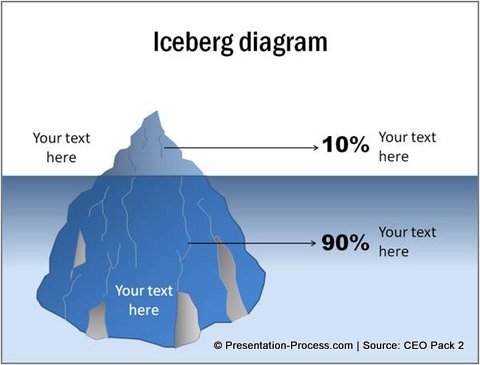 Sometimes clichéd phrases like ‘tip of an iceberg’ work so well as business metaphors in PowerPoint. The following diagram template helps you visualize the concept: