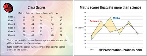 Let’s see how you can rework the ‘usual’ PowerPoint data slides and bring clarity to our message. We will take a poor slide and try to present it in a better way. Here is a slide which shows a table of data related to student scores.