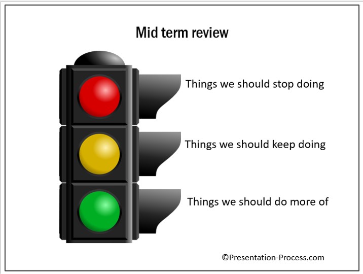 In this example, a traffic signal is used to highlight the importance of various tasks. Everyone knows the significance of the different colored lights in the signal. That common knowledge is transferred to the agenda slide to talk about the tasks that need to be stopped, continued and increased.