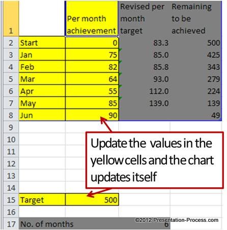Just enter the production target, number of months and per month achievement. The preformatted chart template takes care of the rest.
